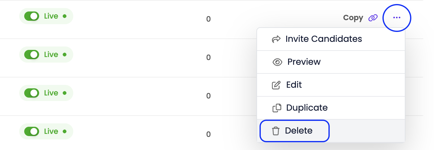 Important: Once you delete an assessment none of the candidate responses can be recovered under any circumstances, so please be 100% sure before doing so.